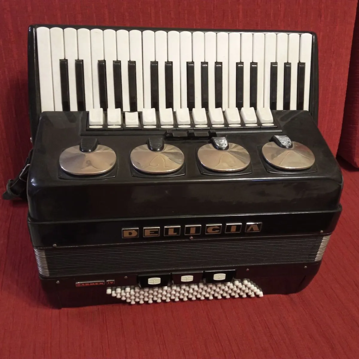 Ακορντεόν ελάχιστα δουλεμένο ,σε άριστη κατάσταση, με τη βαλίτσα του, μεταλλικό πτυσσόμενο αναλόγιο και πολλές παρτιτούρες.