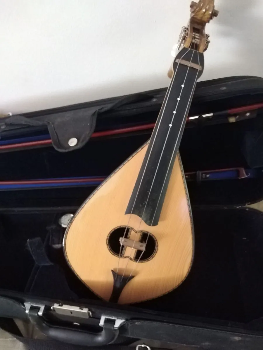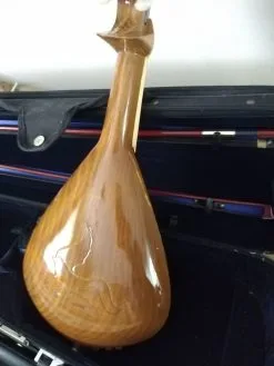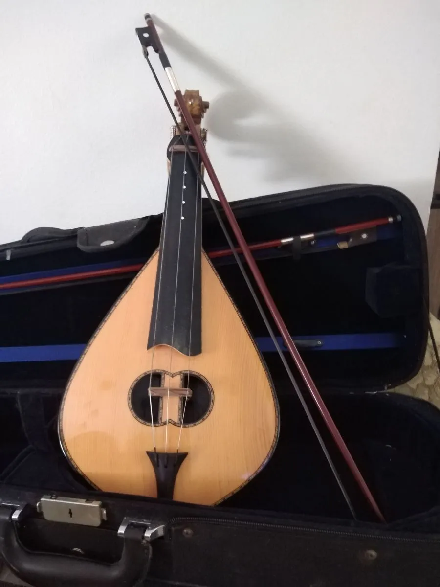 Χειροποιητη κρητικη λυρα. Εξ’ολοκληρου φτιαγμενη στο χερι. Με δυο δοξαρια και σκληρη θηκη – βαλιτσα.