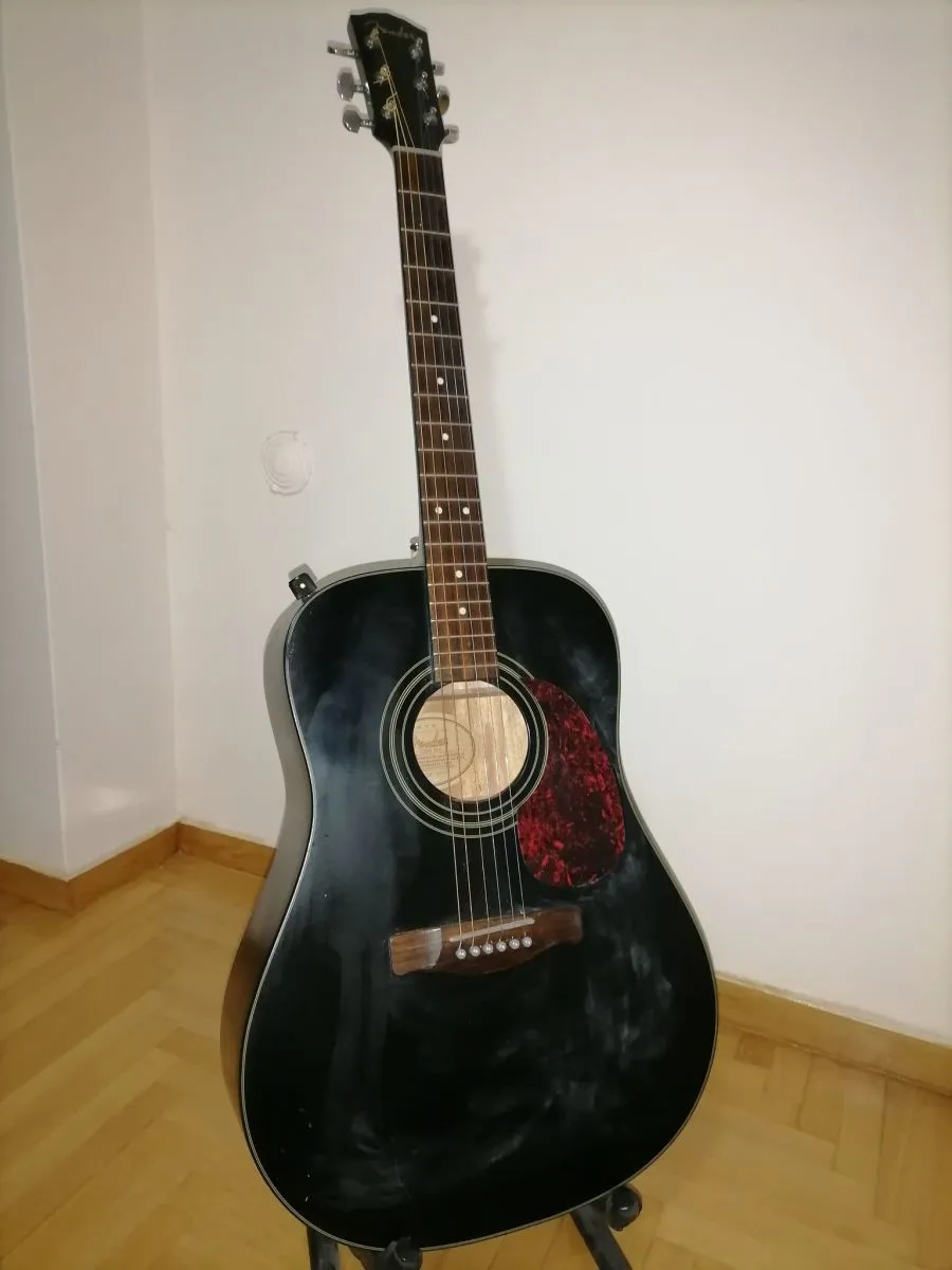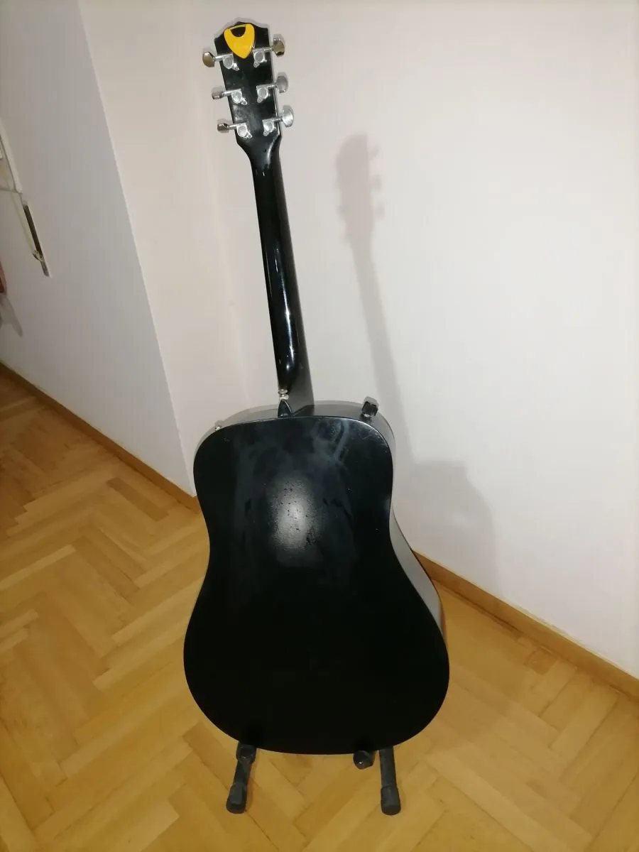 Ακουστικη κιθαρα, προσεγμένη και συντηρημενη. Έχει μετατραπει σε ηλεκτροακουστικη, (φωτο 5-6), από επαγγελματία ηλεκτρονικό ηχου, με χρήση καλών υλικών κ συνδέσεων, με βισμα “τζακ 6.3”, και με ρύθμιση εντασης, με ομορφο ήχο σε ενισχυτη.