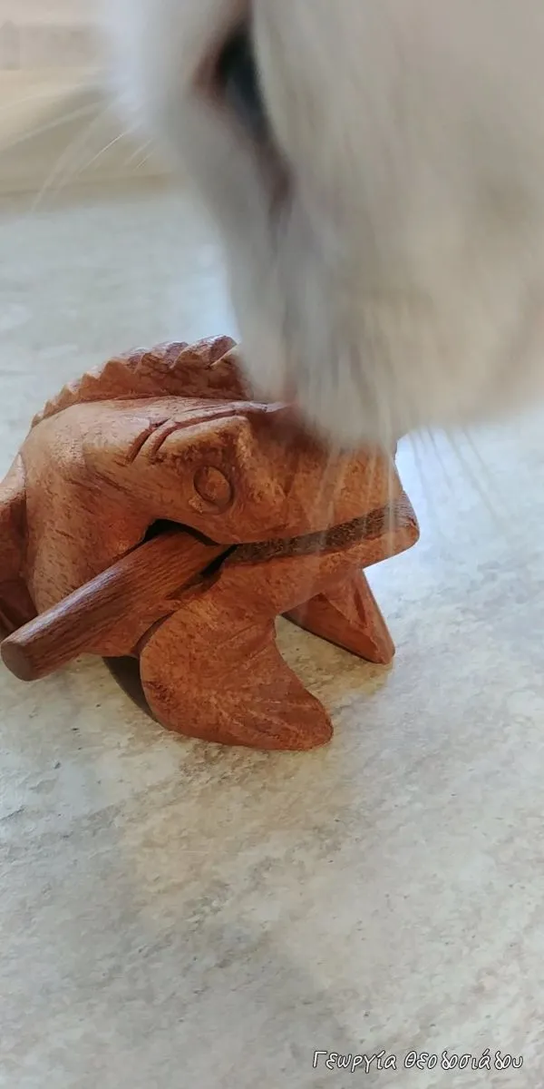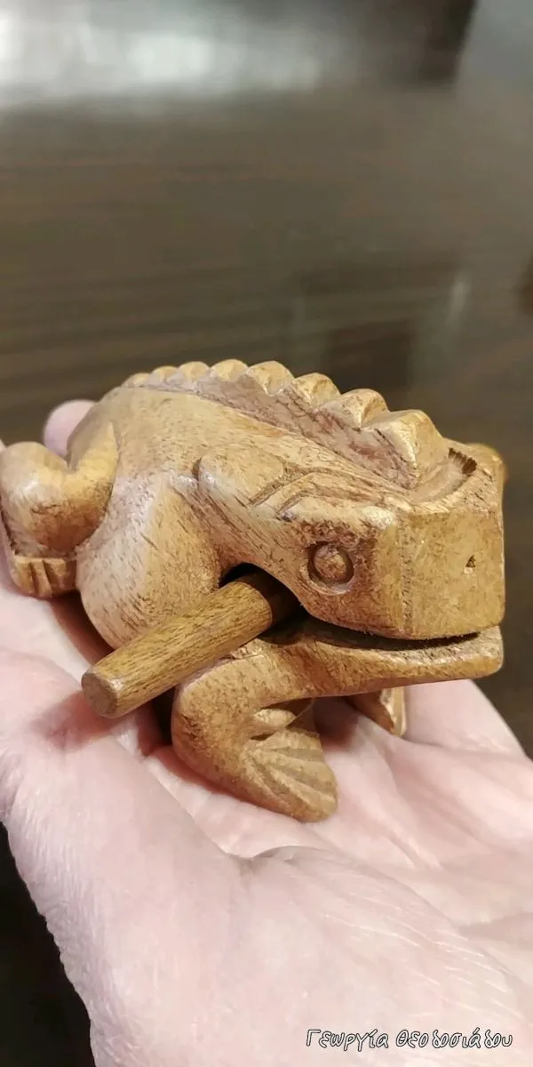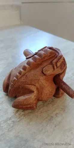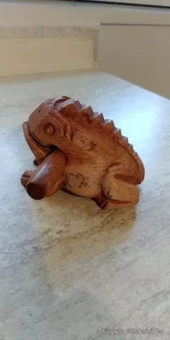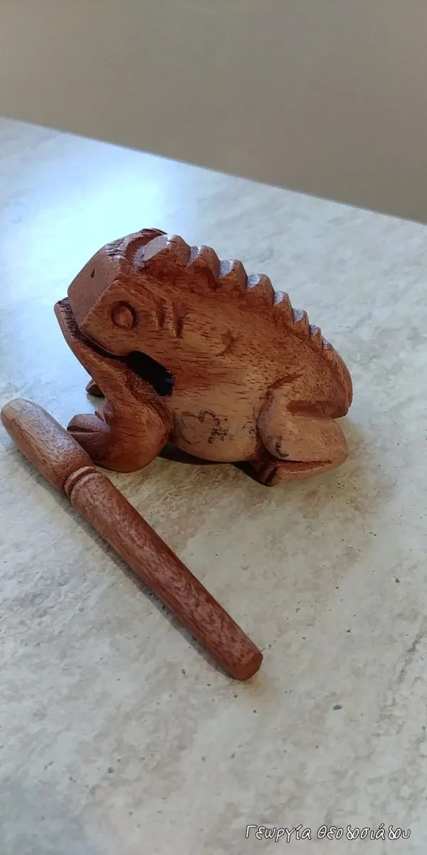 Ξύλινο γκουίρο, σε σχήμα βατράχου. Περιλαμβάνει κοπανάκι. Αγορασμένο από την Ελάτη.