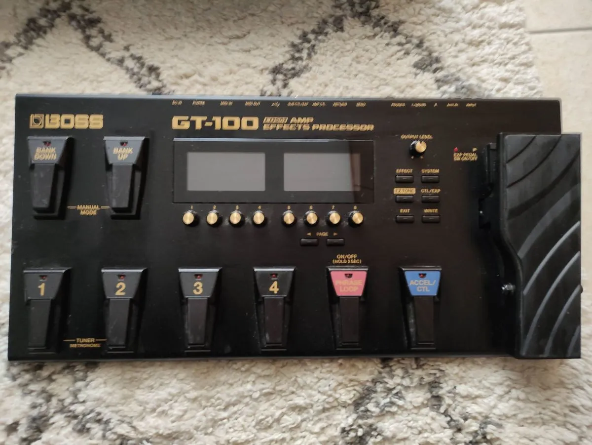 Πεταλιέρα Multi-Effect Boss GT-100 μαζί με θήκη μεταφοράς Thomann.Σε άριστη κατάσταση αποθήκευμενο στη θήκη του και χρησιμοποιημένο πολύ λίγο για διάστημα 4 μηνών μόνο.