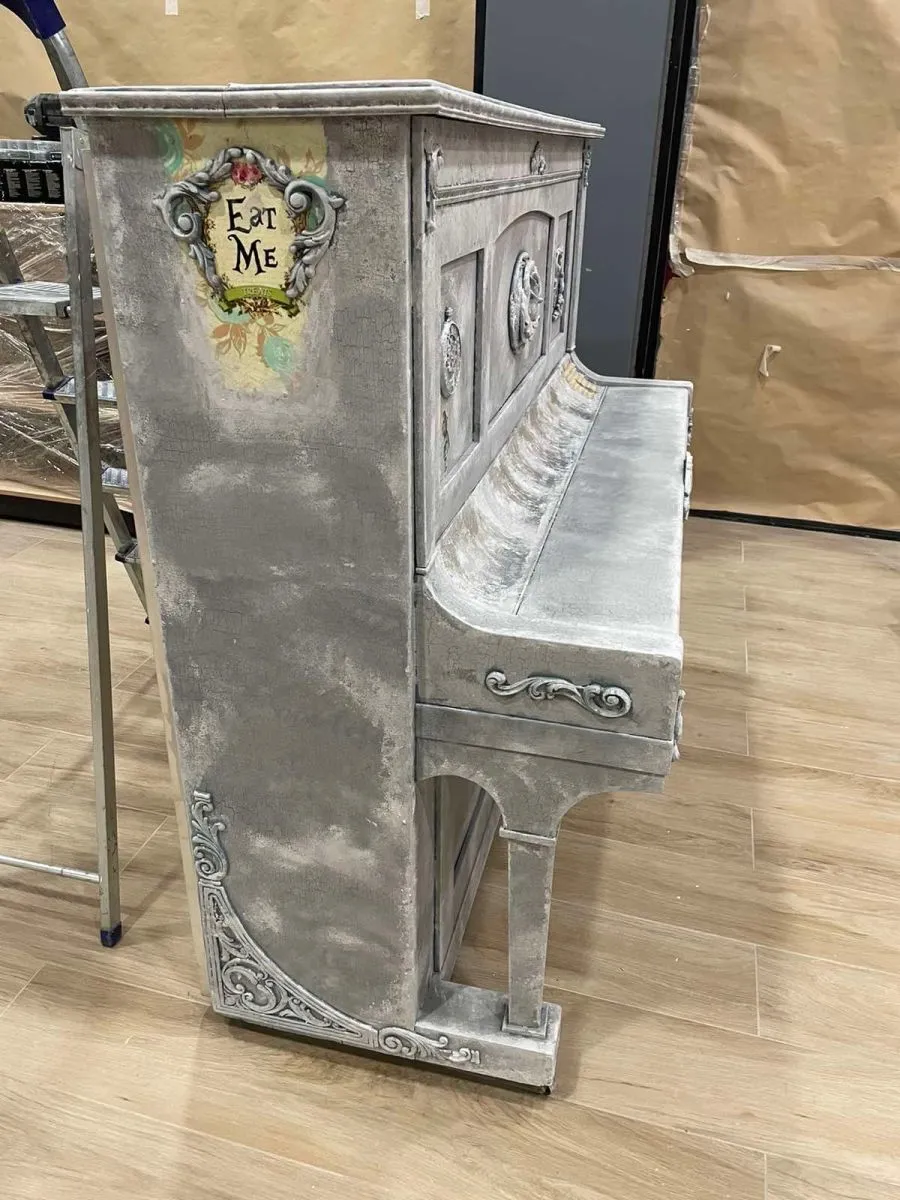 πιάνο αντίκα βγαλμένο από το παραμύθι η Αλίκη στη χώρα των θαυμάτων βαμμένο με καλλιτεχνική παλαίωση.