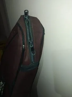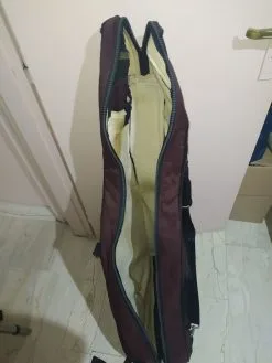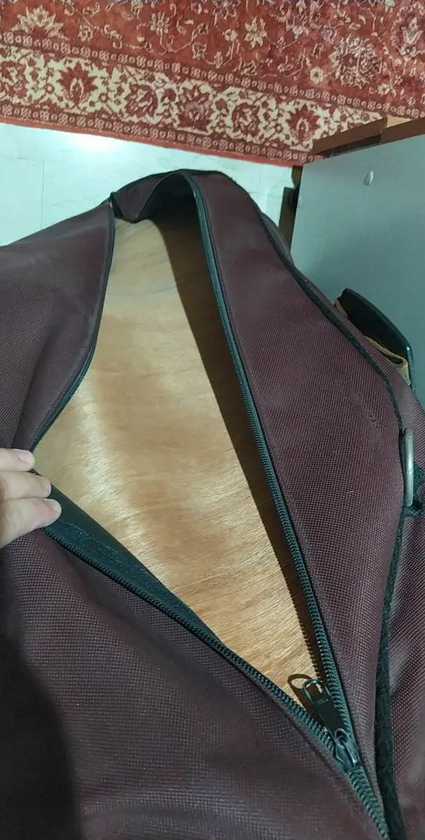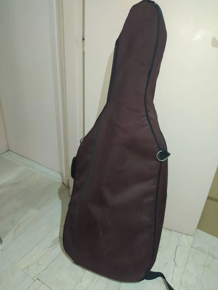 Θήκη βιολοντσέλου με ξύλο εσωτερικά και μαλακό ύφασμα και αφρολέξ επένδυση. Μια θήκη εξωτερικά για βιβλία. Πολύ γερή θήκη, με 2 ιμάντες και χειρολαβή. Χρώμα Μπορντώ. Εσωτερικά το ύφασμα έχει φθαρεί σε ένα σημείο, όπως και το αφρολεξ.