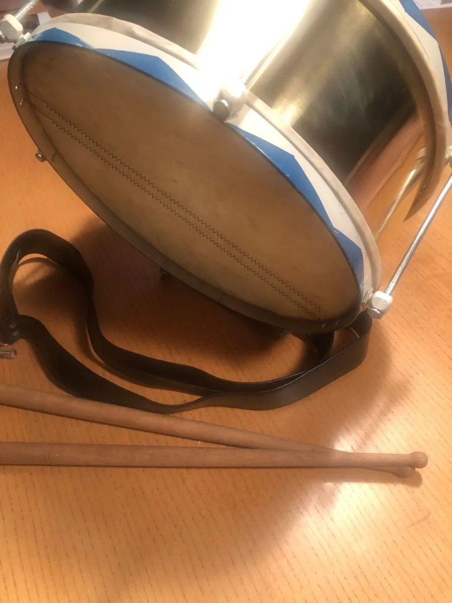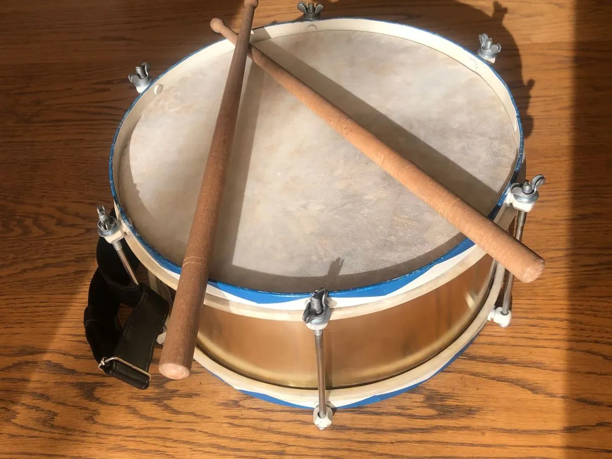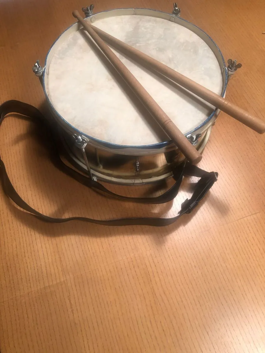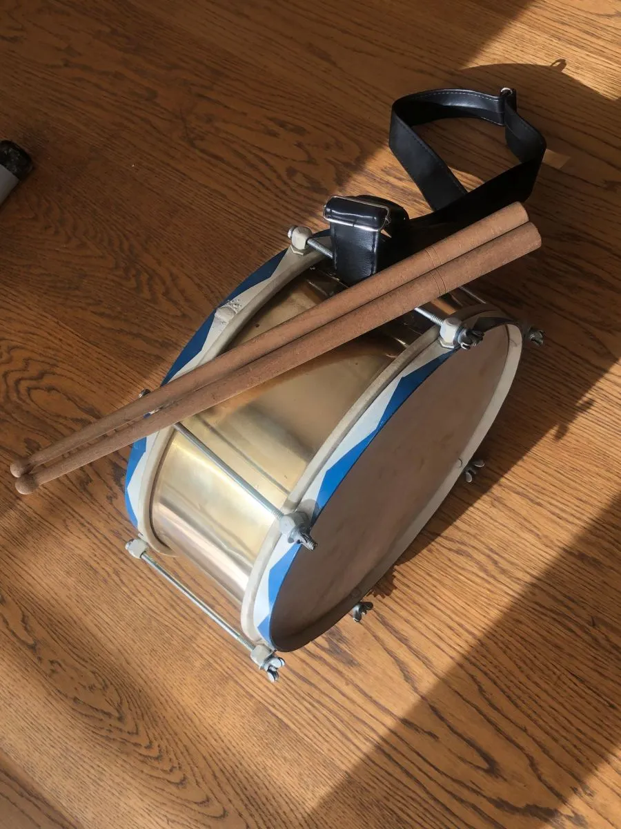 Vintage τύμπανο παρέλασης (’70s) με ιμάντα και ξύλινες μπαγκέτες, σε πολύ καλή κατάσταση.