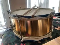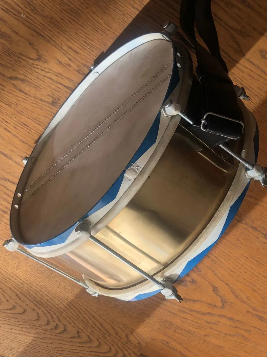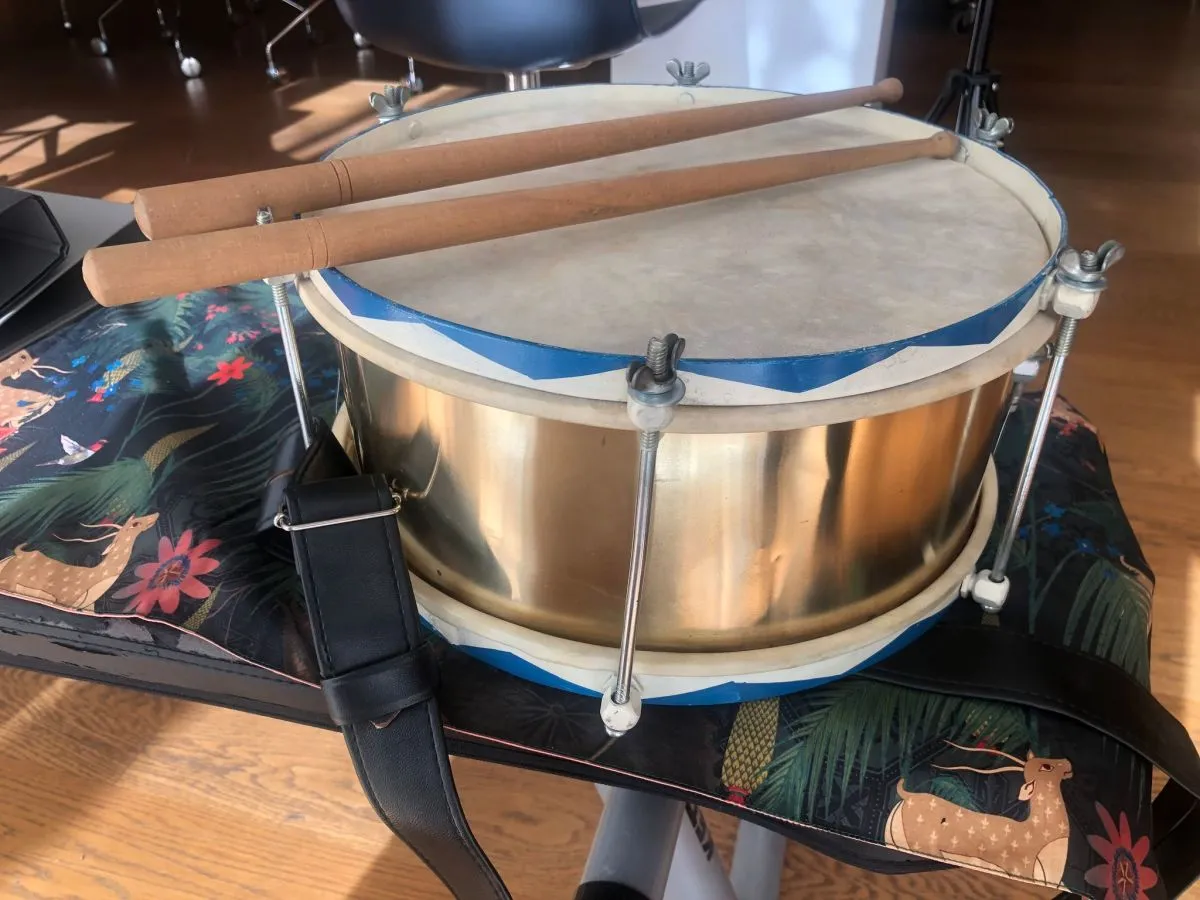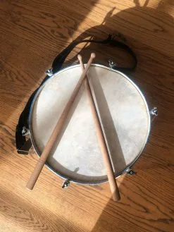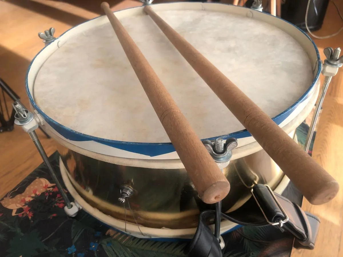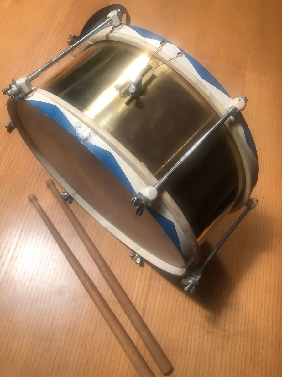 Vintage τύμπανο παρέλασης (’70s) με ιμάντα και ξύλινες μπαγκέτες, σε πολύ καλή κατάσταση.