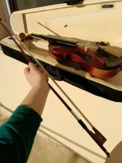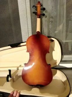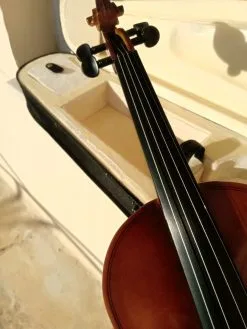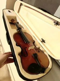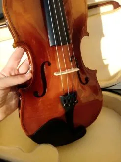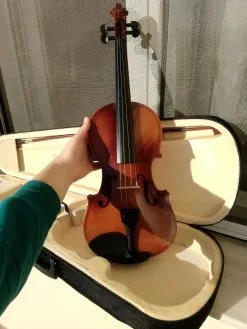 Βιολί μεγέθους 4/4 χειροποίητο με δοξάρι καινούργιο από επιλεγμένα ξυλα που έχουν επιλεγεί για τις εκπληκτικές ακουστικές τους ιδιότητες. Μαζι με θήκη με εσωτερικό βελούδο και σαπουνακι για τις χορδές.